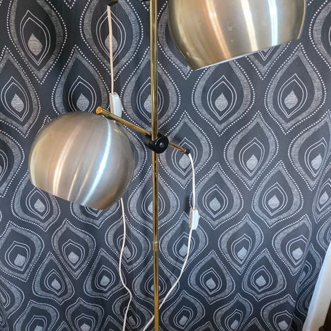Fin vintage kulelampe med to runde, justerbare lampeskjermer i messingfarget metall. Lampen har slank stang og rund fot i samme utførelse. Hver skjerm kan vinkles for å rette lyset i ønsket retning.