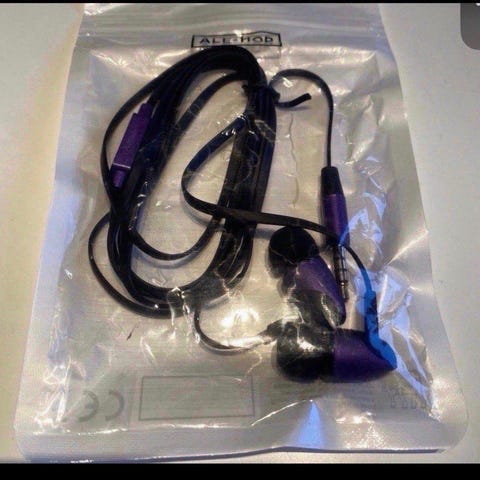 hodetelefoner med ledning, svart og lilla farge. Inkluderer ørepropper og mikrofon. Passer til generell bruk.