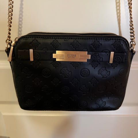 Guess lommebok for dame i svart kunstlær. Lommeboken har preget logomønster på utsiden og avtagbar håndrem. Innvendig er det flere kortlommer, egen lomme med vindu for ID eller bilde, samt glidelåslomme som kan brukes til mynter eller småting. Lukkes med glidelås og trykknapp. Egnet til daglig bruk eller som liten clutch med håndrem.