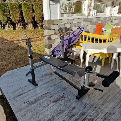 Eldre treningsbenk med tilhørende stang og vekter ca 60 kg Stått lagret i fuktig rom så det er litt rust på den