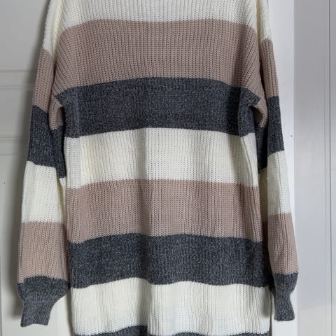 Kan brukes som genserkjole. har brede horisontale striper i brun og lys beige. Modellen har rund hals og ribbestrikkede kanter nederst og på ermene. Passer til hverdagsbruk og kan kombineres med både bukser og skjørt.