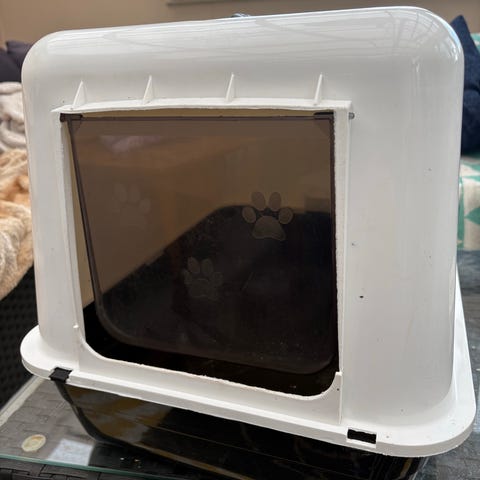 Rektangulær kattedo i plast i brun og hvit farge. Åpen modell uten lokk, egnet for bruk med kattesand. Passer til innendørs bruk for katt. Lett å rengjøre og flytte på, og kan plasseres på bad, vaskerom eller andre egnede rom i hjemmet.