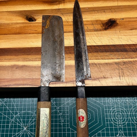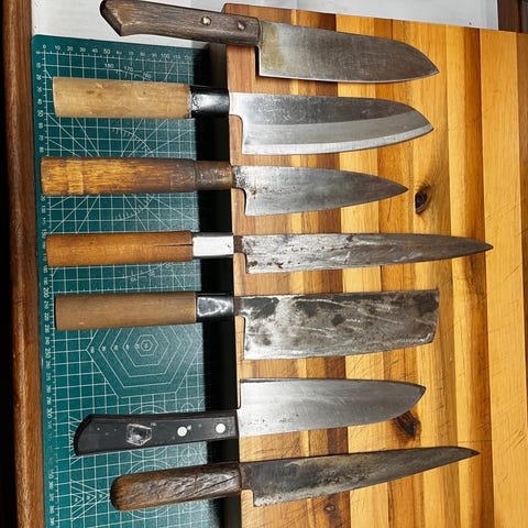 Den ene Gyuto kniven er bøyd (se siste bilde), Yanagibaen er ekstremt lang og framstår som ny/ubrukt.