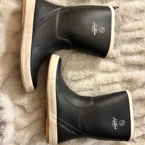 Kadet Klassik gummistøvler i størrelse 41. Modellen er en klassisk, kort gummistøvel i svart med lys såle og kant. Støvlene har mønstret yttersåle i gummi for bedre grep på vått underlag. Innvendig har de lyst fôr. Egnet til bruk i vått vær, på tur og fritid, for eksempel til fotturer på våte stier eller i urbane omgivelser. Den er nesten ikke brukt, original pris på 700, til salg på 200kr.