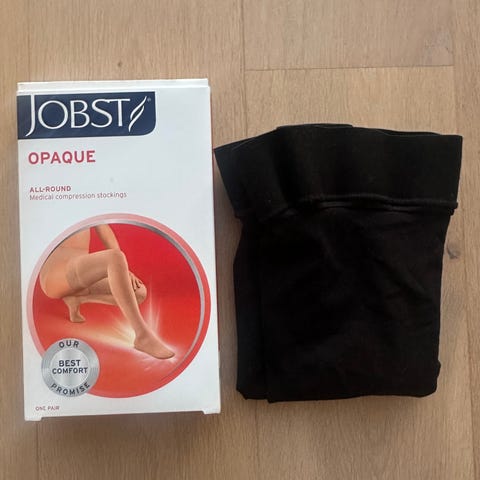 silikonbånd øverst for bedre feste. Strømpen er beregnet som kompresjonsstrømpe opptil lår. i original eske med produktinformasjon på emballasjen.