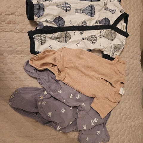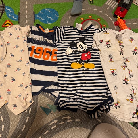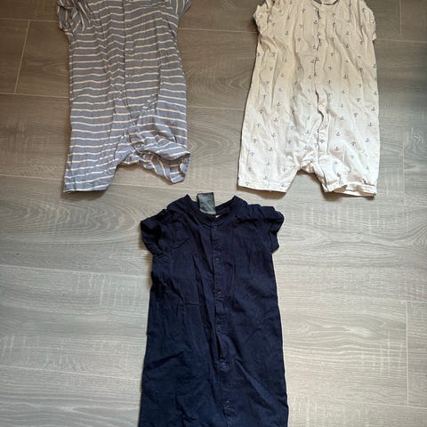 3 stk H&M kortermet romper i bomull for barn, unisex, størrelse 92. Laget av 100 % bomull og har kort erm og ben, med knepping foran. Flerfarget design med ulike mønstre og ensfargede varianter. Egnet som behagelig hverdagsplagg eller nattplagg for barn i størrelse 92.