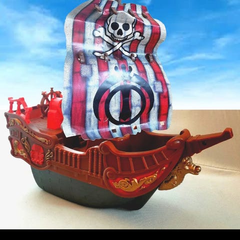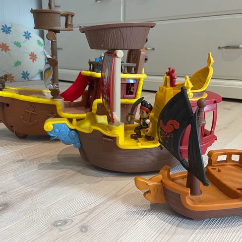 Pirat lekeskip med to pirater og en papegøye. Lekeskipet har hjul under slik at det kan trilles bortover gulvet. Lager lyder og musikk, og mange morsomme knapper. Fungerer som den skal og vært høyt elsket her. Passer fra 0 år og oppover. Kan også overleveres når Oslo tingrett.