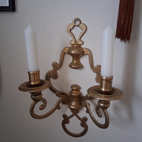 Retro, vegghengt lysestake i keramikk med dekor i grønntoner selges for 250,-
