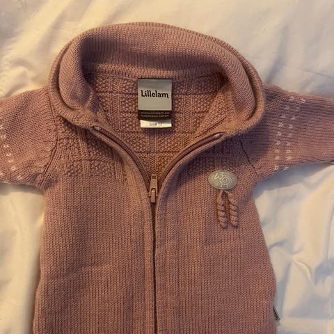 Lillelam ulldress / sparkedeess i størrelse 92. Dressen er i lilla (noen vil mene mørkerosa) ull med hette og glidelås foran. Den har strukturstrikket mønster øverst på bryst og rygg, samt ribbekanter ved ermer og ben. Plagget er laget i ull, som gir god varme og komfort for barnet. Passer godt som kosedress eller mellomlag på kjølige dager.