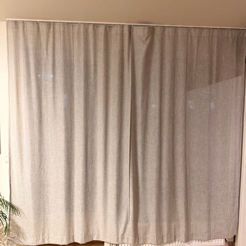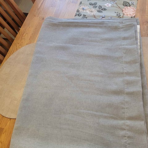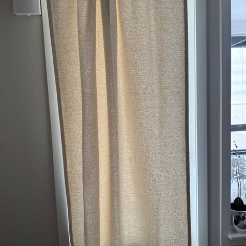 Lystett gardin fra kid. Har selv lagt de opp, de er nå ca 169 cm lange og 135 brede. Oppheng med rynkebånd.