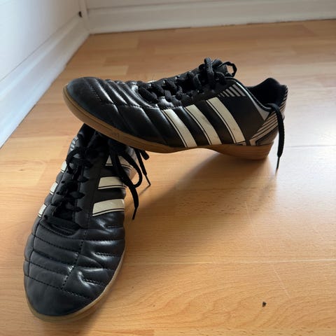 Adidas innendørs fotballsko i størrelse 38. Skoene har svart overdel med hvite striper og rød hæl, samt lys gummisåle som er egnet for innendørs bruk på hallgulv. Snøring for justering av passform og polstret hælparti for økt komfort. Passer til futsal og annen innendørs ballidrett.