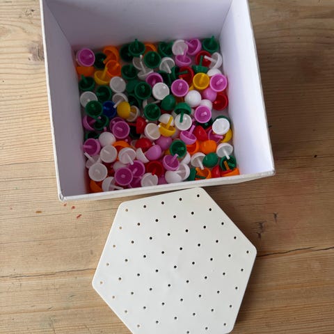 9-åringen rydder og selger noen av lekene sine for å spare til andre ting. Han selger to perlebrett og 547 Hama perler/sticks.