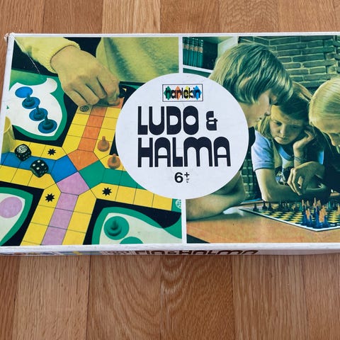 Gammelt spill . Spillet består av et sammenleggbart spillebrett med rutemønster i gult og grønt med røde og blå trappeformede linjer. Esken har lokk med illustrasjon av spillebrikker på et rutete brett. Det følger med en pose med små, fargerike spillebrikker i flere farger. Egnet som familiespill eller selskapsspill, for flere spillere samtidig.