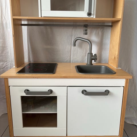 Lekekjøkken i tre med komfyrplate og vask. Komfyrplaten har to plater som begge har leddlys som kan vise at platen er på. Lysene er reparet slik at lysene lyser en kort stund. Kjøkkenet har benkeplate i treutførelse, to kokeplater, vask med kran og oppbevaringsplass i skap og åpne hyller under benken. Over benkeplaten er det en hylle med stang og kroker til oppheng av utstyr. Egnet som lekekjøkken for barn i innemiljø, for eksempel på barnerom eller lekerom.