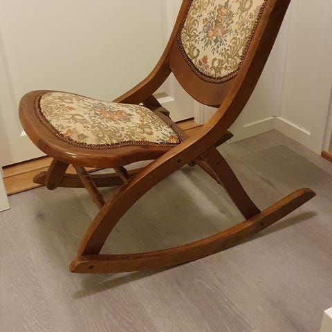 Gyngestol i tre med sete og rygg i rotting. God stand