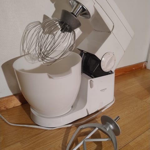 Kenwood kjøkkenmaskin i grå utførelse med rustfri stålbolle. Maskinen leveres med flere røreverktøy, blant annet visp, deigkrok og K-spade. I tillegg følger det med blenderkanne og kjøttkvern-/maltetilbehør med ulike skiver. Hastigheten justeres med dreiehjul på siden av maskinen. Egnet til elting av deig, pisking, røring og miksing av ulike råvarer på kjøkkenet.