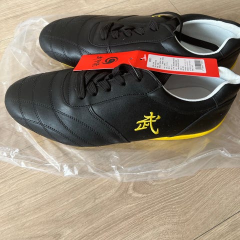 Taekwondo sko for kampsport i størrelse 46. Skoene er hovedsakelig hvite med flerfargede detaljer og grønn yttersåle med mønster for godt grep på matte eller innendørs underlag. Overdelen er lav og uten lisser, med elastisk åpning for enkel av- og påtaking. Leveres med oransje taekwondo-trekkpose for oppbevaring og transport.