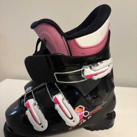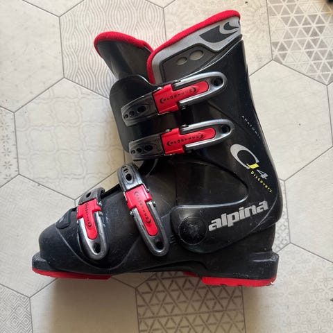 Alpina skistøvler i størrelse 235 (275 mm sålelengde). Modellen er i svart med rosa og hvite detaljer. Støvlene har fire spenner i metall for justering og god tilpasning til foten. Innerstøvelen er polstret for økt komfort og støtte.