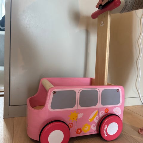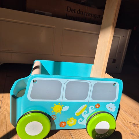 IKEA gåvogn i tre i form av en gul buss. Gåvognen har fire hjul, høy håndtakstang i tre og et åpent laste-/oppbevaringsrom. Håndtaket har et farget grep øverst. Egnet som støtte når barn øver på å gå, samt til lek og transport av leker.