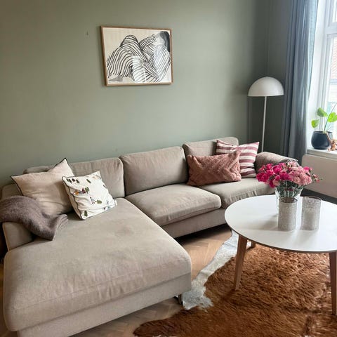 Velholdt sofa med god sittekomfort. Skumputer. Fargen er en mellomting mellom mørkeblå og kongeblå.