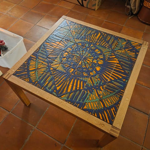 Vintage retro bord salongbord stuebord interiør mcm fliser flislagt teak runde ben messingbelagt