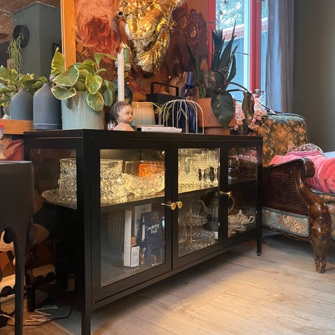 Pent brukt vitrineskap, skjenk, bord og stoler.
