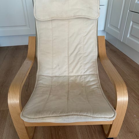 IKEA barnestol i lyst treverk med avtagbart hvitt stofftrekk. Stolen har buede armlener og lav sittehøyde tilpasset barn. Passer til bruk på barnerom, i stue eller lekeområde som egen stol til barnet. Trekket kan tas av for rengjøring. Trekket er nyvasket, men det er to lyse flekker som ikke går vekk etter vanlig 40 graders vask. Kanskje kan disse gå av med litt flekkfjerner. De avbildet på 3. bilde. Stolen er egnet for innendørs bruk.