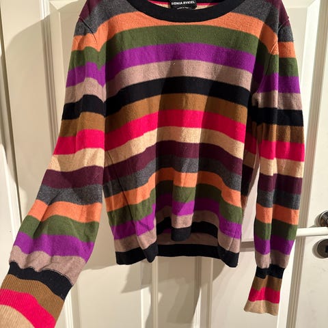 Ganni genser for dame i størrelse M. Genseren er flerfarget med horisontale striper og har rund hals. Den er laget av 100 % kasjmir. På skulderen har genseren dekorative knapper. Passer som hverdagsplagg eller til mer pyntede anledninger i kjøligere vær.