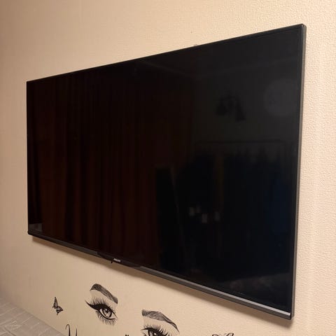 Philips TV i svart utførelse. Skjermen har rektangulær form med smal ramme. Det følger med original fjernkontroll fra Philips. TV-en kan brukes til vanlig TV-titting, strømming og tilkobling av eksterne enheter via tilgjengelige tilkoblingsporter på baksiden eller siden av apparatet, avhengig av modell. Nøyaktig modellbetegnelse og tekniske spesifikasjoner som skjermstørrelse, oppløsning og smart-funksjoner er ikke oppgitt og kan eventuelt sjekkes på typeskiltet bak på TV-en.