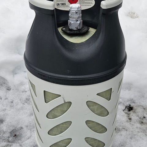 Gassflaske 10 kg kompositt (Tara 5,3 kg). Ca. 2 kg propan igjen på flasken.