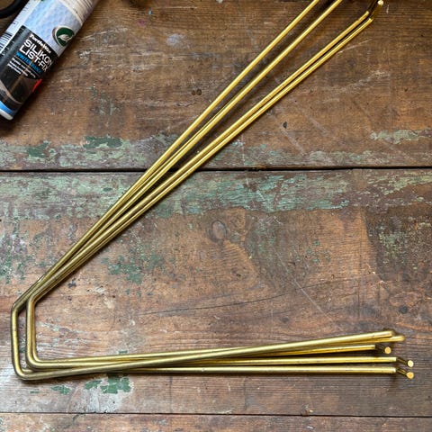 Hylle i teakfinér med gullfargede hylleknekter.