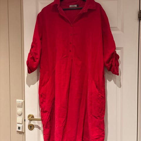 Tulip & Tatamo hverdagskjole i størrelse S for dame. Kjolen er rød og laget i bomull. Modellen har trekvart ermer, rund hals og glidelås ved skulderen. Det er glidelåslommer i sidene. Passer som en enkel og behagelig hverdagskjole.