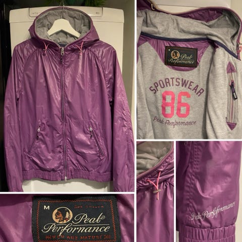 Peak Performance treningsjakke for dame i størrelse M. Jakken er rød med diskret mønster og har kontrastfarget, lys blå innside i kragen. Den har hel glidelås foran og to glidelåslommer i siden. Passer til fitness og annen trening, samt som lett overtrekksjakke i hverdagen. Materialet fremstår som et lett og funksjonelt stoff som gir god bevegelsesfrihet.