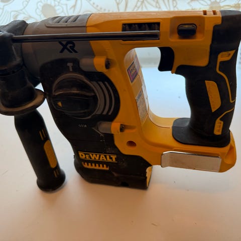 Batteridrevet borhammer i DeWalt XR-serien, egnet for boring og meisling i betong, mur og andre harde materialer. Maskinen drives av 18V XR Li-Ion batteri, og settet på bildene inkluderer borhammer, batteri(er), lader og formstøpt koffert for oppbevaring og transport.