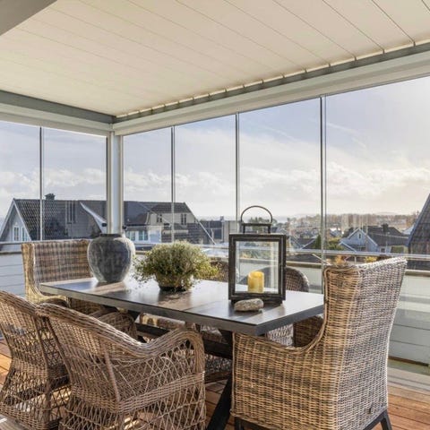 Det manuelt justerbare taket gir deg full kontroll - åpne for sollys eller lukk for skygge og beskyttelse. Integrert LED-lys som vi aldri har testet om det virker, da pergolan fulgte med huset. Nedtrekkbar solskjerm på den ene langveggen. Må demonteres av kjøper.
