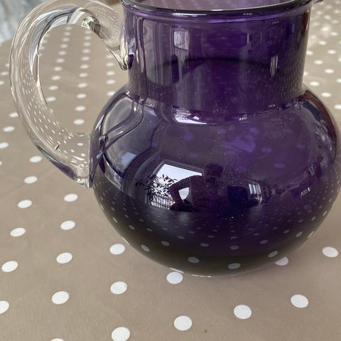 Keramikkkanne med lokk i blå glasur. Kannen har helletut og hank, samt dekorative detaljer i kontrastfarger mot bunnen og på lokket. Egner seg til servering av for eksempel saft, vann eller andre drikker, eller som dekorasjonsgjenstand. Størrelsen fremgår av bildene med tommestokk for høyde og bredde.Ett bitte bitte lite nag , på tuten, men veldig lite synbart.