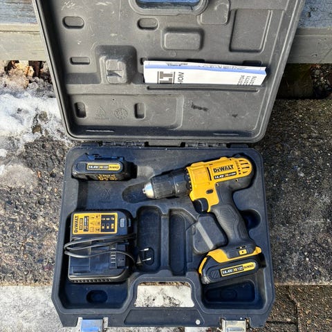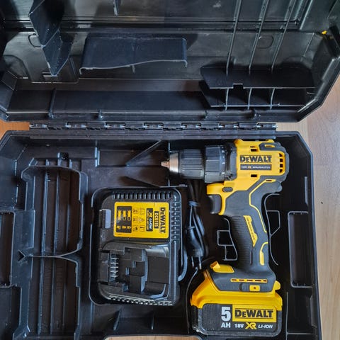 - Plastkoffert med formtilpassede rom for drill, batterier og lader