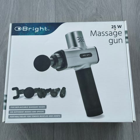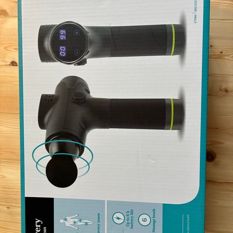 Håndholdt massage gun i grå farge. Leveres i eske med flere utskiftbare massasjehoder for ulike muskelgrupper, blant annet kulehode, gaffelhode og spisst hode. Enheten har oppladbart batteri og lades med medfølgende USB‑kabel. Egner seg til punktmassasje og muskelbehandling hjemme eller på trening. Kun brukt ved mottak for testing. Fra temu
