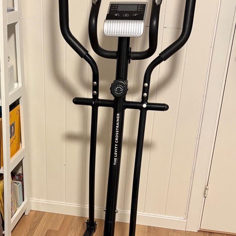 Abilica ellipsemaskin i svart utførelse. Maskinen har store fotplater og bevegelige håndtak for helkroppstrening. Konsoll med display er plassert foran for oversikt over treningsdata. Egnet til kondisjonstrening innendørs i hjemmemiljø. Drevet elektrisk via strømtilkobling som vises på bildene.