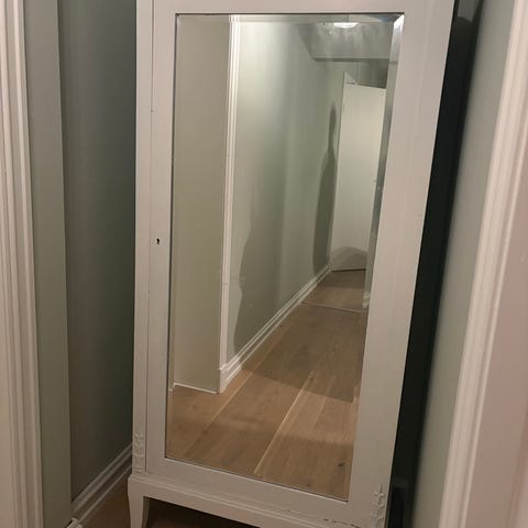 Selger mitt speilskap fra IKEA grunnet flytting. Den tar liten plass og rommer mye, det er 5 hyller inni skapet.