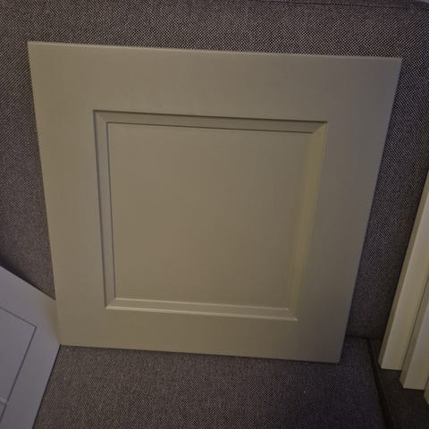 Profilerte kjøkkenfronter i hvit utførelse. Type Bodbyn fra IKEA Frontene har klassisk rammedesign og leveres med ferdig borede hull til håndtak på enkelte av delene. 12,6cm mellom hullene. Egnet som skapdører eller fronter til kjøkkenskuffer og integrerte hvitevarer, avhengig av mål og montering. 3 stk 20x60cm skuffefronter. 3 stk 40x60cm skuffefronter. 1 stk 60x80cm dør til oppvaskemaskin. 1 stk 60x80cm skapdør. 2 stk glassdører 40x80cm 1 stk 60x60cm skapdør. Selges helst samlet. Nypris på IKEA 5500,- Selges uten håndtak.