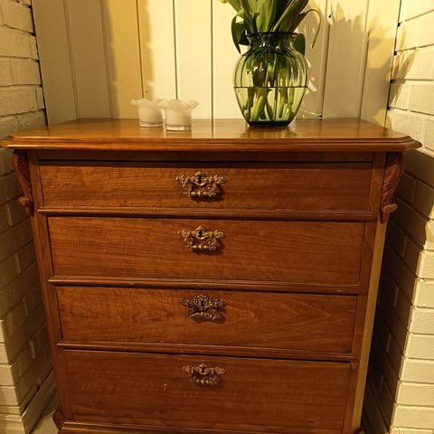 Elegant kommode i fransk stil. I øverste skuff er det også 6 småskuffer. 2 nøkler medfølger. Noen småskraper, men i god stand.