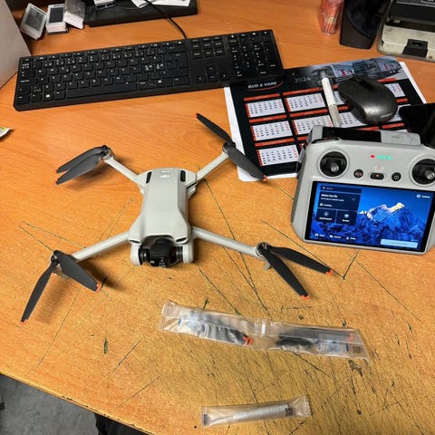 DJI Mini 3 drone med sammenleggbar konstruksjon og fjernkontroller med innebygd skjerm. Dronen leveres med flere propellsett, ekstra batterier, ladestasjon, kabler, verktøy. Kameraet er montert på gimbal for stabilisert opptak. Egnet for foto og video fra lufta, samt rekreasjonsflyging.