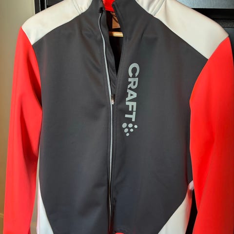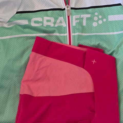 Craft sykkeltrøye og shorts i rød og hvit farge med glidelås i halsen. De har har trykket Craft-logo og kontrastdetaljer i gult. Laget i teknisk, pustende materiale egnet for sykling og annen trening. Modellen på trøya har kort glidelås foran og er tilpasset for god bevegelsesfrihet.