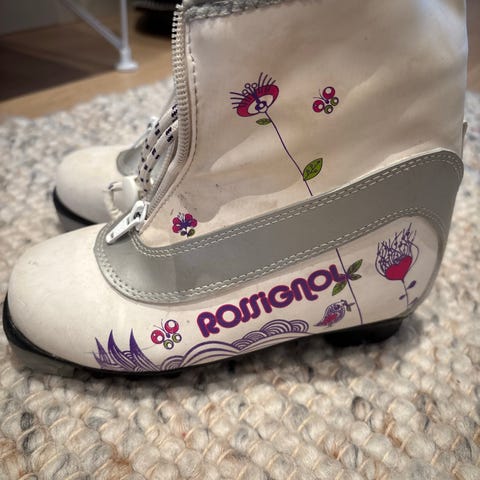Rossignol langrennsstøvler i hvit og grå med lilla detaljer. Støvlene har snøring foran med snørelås og glidelås over snøringen. Innsiden er fôret med mykt, isolerende materiale for ekstra varme. Yttersålen er i gummi med tradisjonell tåbinding for langrennsski. Egnet til bruk på kalde dager i preparerte løyper.