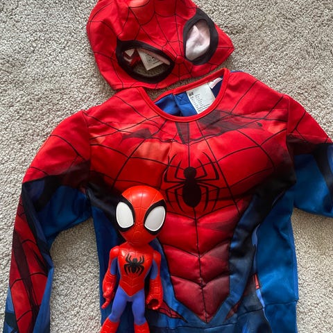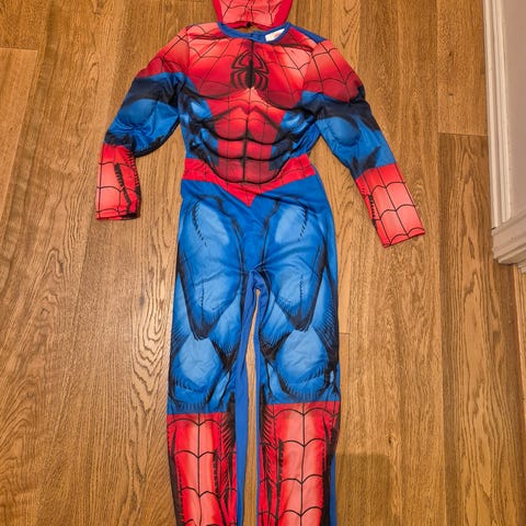H&M kostyme for gutt i størrelse 128. Kostymet er flerfarget med rødt og blått mønster og er laget i polyester. Det består av heldrakt med hette og glidelås bak. Passer som utkledningsdrakt til barn i ca. 7–8-årsalderen.