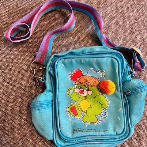 Vintage Peanuts Snoopy skulderveske med trykk i blått med gule detaljer. Vesken har motiv av Snoopy og Woodstock foran med teksten «Keep Smiling» og regnbuemotiv. Justerbar skulderrem med kontrastfarget innside. Hovedrom med glidelås.