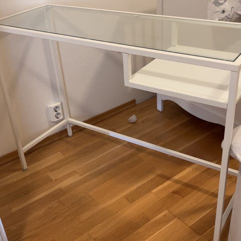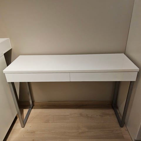 Sminkepult eller skrivepult i med to skuffer foran. Noen synlige flekker oppå plata, kan lett fikses med f.eks dekorplast.