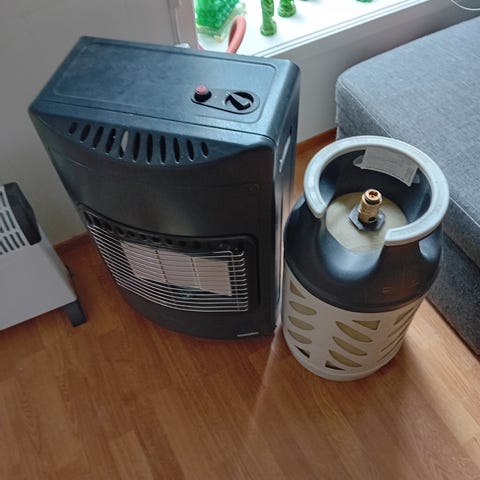 Brukt både inne ou ute på terrassen. Plass til 11kg propan beholder bak