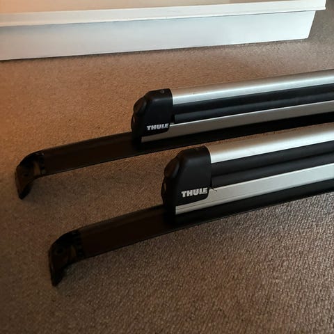 Thule takstativ og skiholdere montert på takstativ. Modellen har aerodynamiske profiler i sølvfarget aluminium med svarte plastender og fester. Egnet for transport av ski eller snowboard på bilens takstativ, avhengig av bredde og kapasitet på holderne. Festet på eksisterende Thule takbøyler med integrerte fester. Passer til Skoda Enyaq. Brukt en sesong